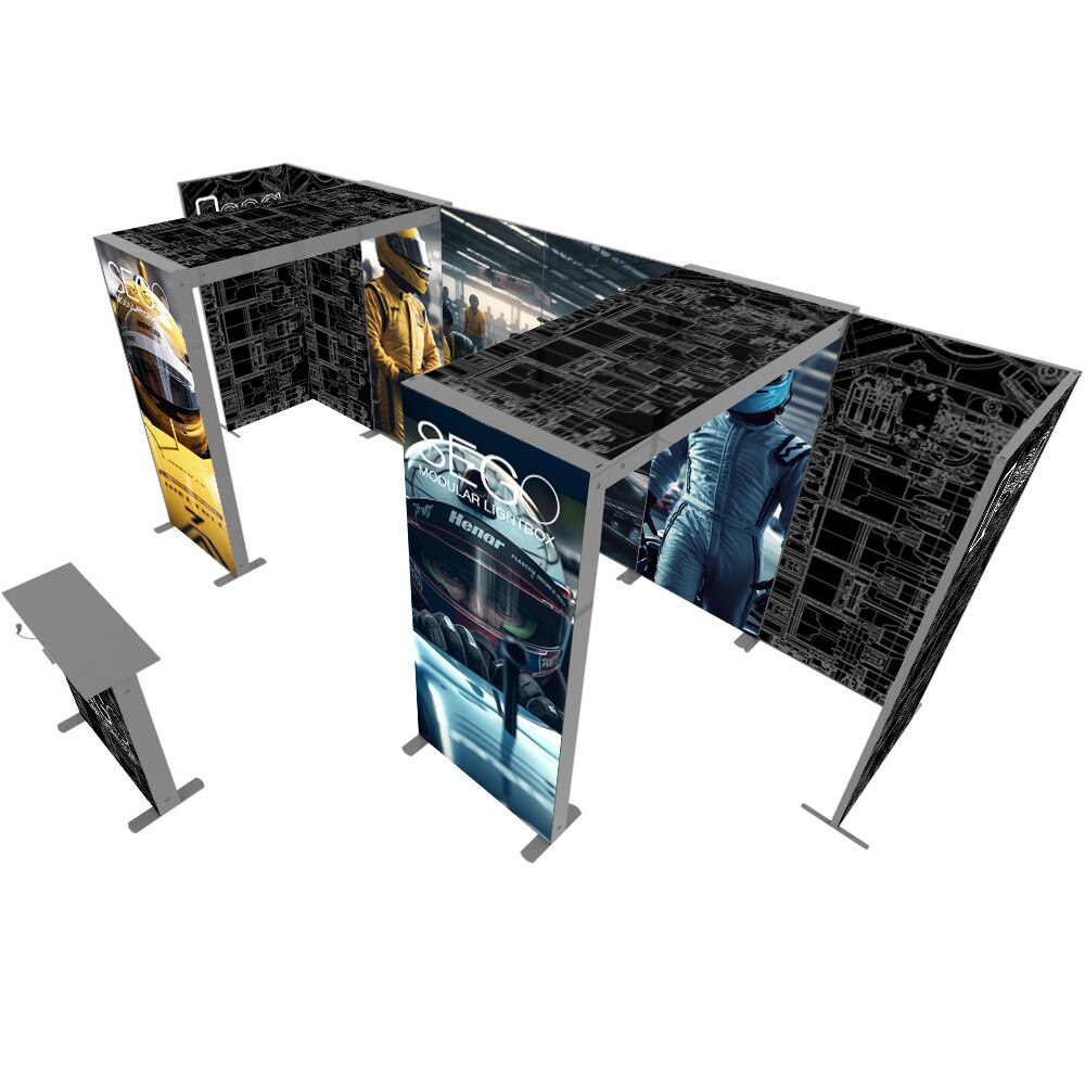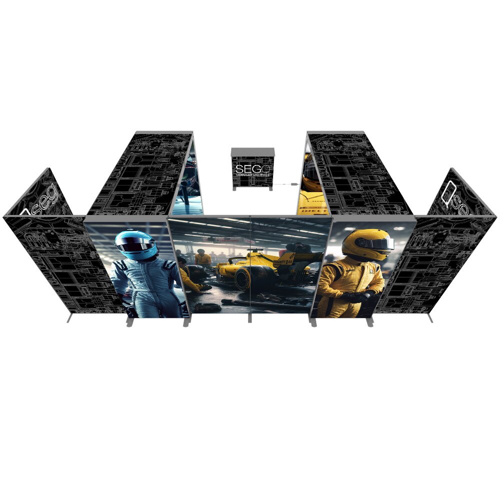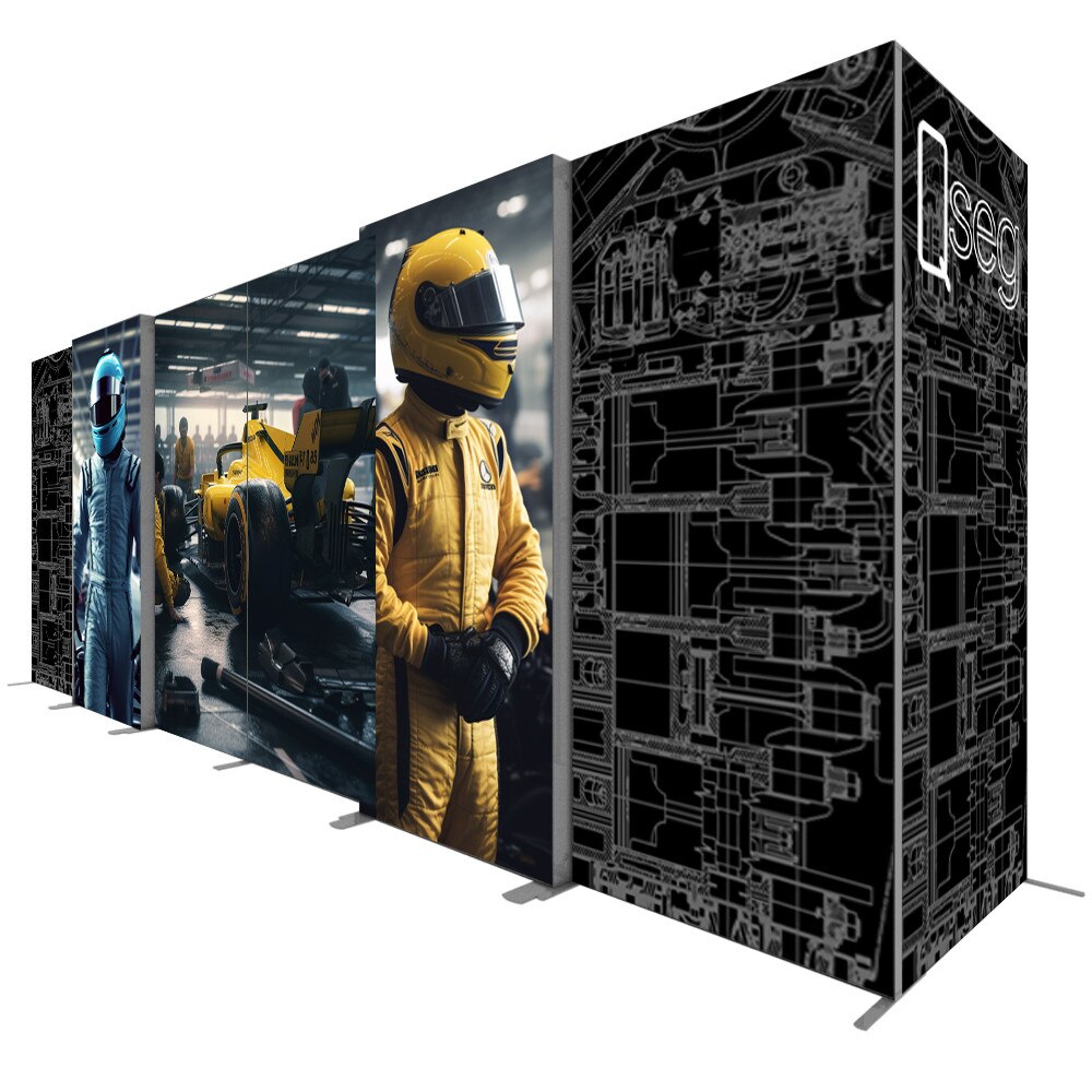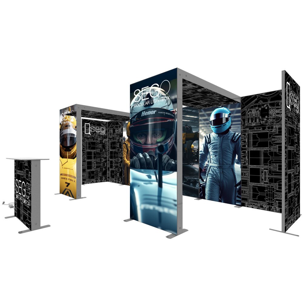 When modular worlds collide! The SEGO + QSEG configurations offer a perfect blend of backlit and non-backlit graphics for your trade show or exhibition needs. Emphasize your message with vibrant backlit graphics on SEGO lightbox frames that pair well with non-backlit graphics on the QSEGs. All frames showcase double-sided graphics so your message can be seen from almost any angle. All graphics are dye-sub printed with SEG (Silicone Edge Graphic) finishing which makes for easy graphic installation and change out. Frame assembly and the modular connection are all tool free so you don’t have to worry about having tools on hand for booth setup and breakdown. Specialized connectors were developed to marry the two systems and have connectors for inline as well as 90º corners. Choose from our standard SEGO + QSEG configurations or contact us for a custom quote. SEGO + QSEG.... Name a better duo I’ll wait...